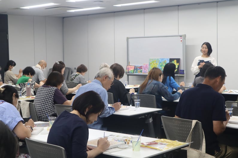 制作も佳境に入った頃には、「ぜひ席を立って、ほかの方の作品も見てみましょう!」という声かけがあり、参加者同士の交流が自然に生まれました。「その色使い、素敵ですね!」といった会話が弾むなど、互いの工夫を参考にしながら筆を加える場面も印象的でした。