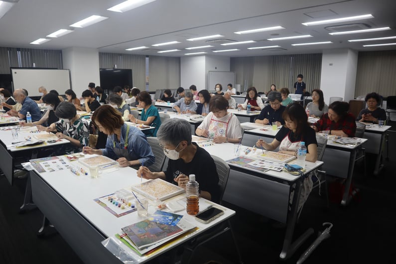 制作も佳境に入った頃には、「ぜひ席を立って、ほかの方の作品も見てみましょう!」という声かけがあり、参加者同士の交流が自然に生まれました。「その色使い、素敵ですね!」といった会話が弾むなど、互いの工夫を参考にしながら筆を加える場面も印象的でした。