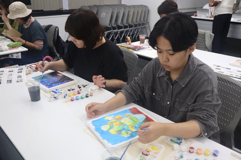題材は、事前に用意されたゴッホの代表作『ひまわり』『星月夜』の2作品からお好きな方を自由に選んでいただきました。あらかじめ下絵が描かれたキャンバスに、自由に色を重ねていくスタイルなので、初めての方でも気軽に楽しめる内容です。 使用したのはアクリル絵の具。水を多く含ませると水彩のように、逆に水を使わずに描くと油絵のような質感になるなど、表現の幅が広いのも魅力です。「試行錯誤しながら、どんどん自由に色を塗ってみてください。」「失敗しても大丈夫。違うなと思ったら拭き取ったり、重ねたりしてみましょう。」と講師のタナカさんの言葉に背中を押され、参加者の皆さまも安心して創作に没頭している様子でした。